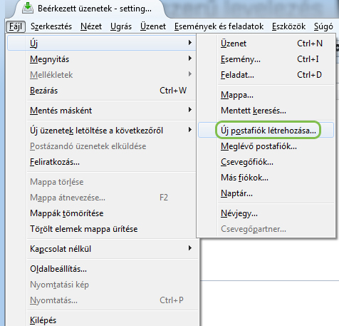 A Thunderbird kliensben kattints a Fájl menüpontra, azon belül navigálj az Új/Új postafiók létrehozása... menüpontra és kattints rá.