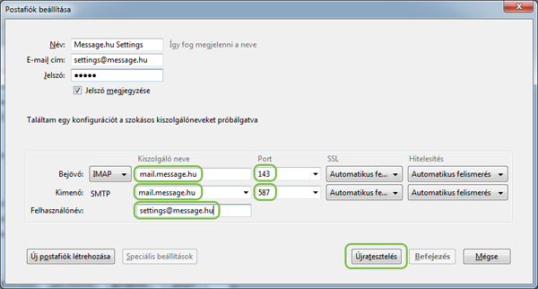 Töltsd ki a mezőket a leírás elején megadott adatokkal a kép alapján, felhasználóneved message.hu-s teljes e-mail címed, majd kattints az Újratesztelés gombra.